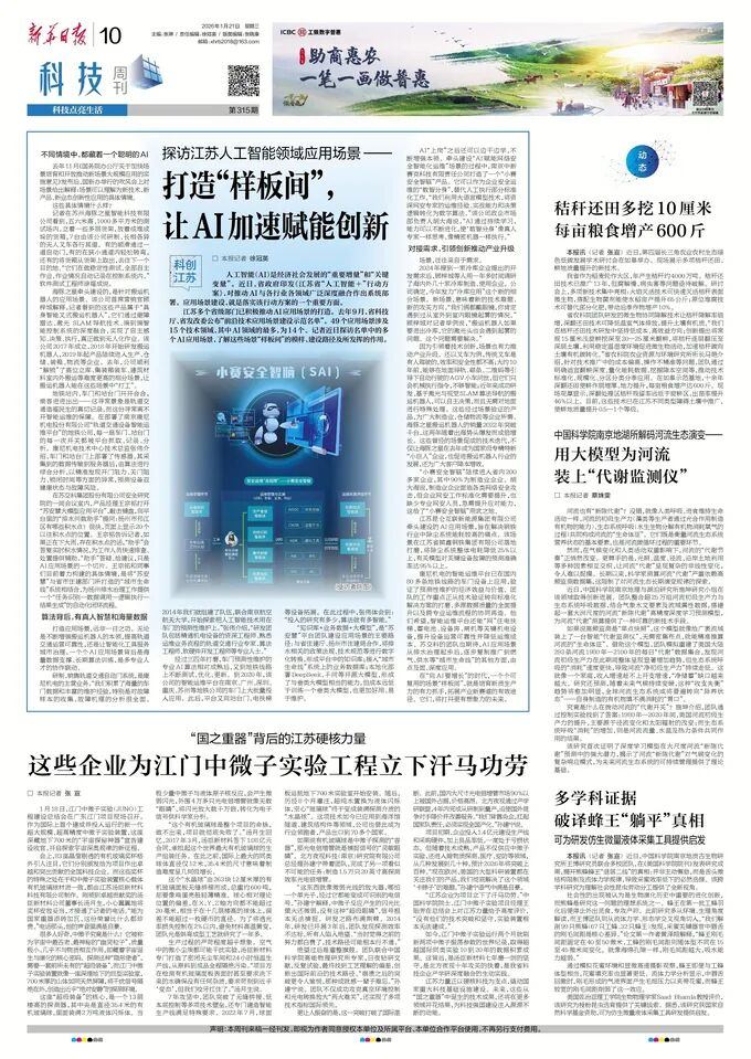 2026年1月21日,《新华日报》以《探访江苏人工智能领域应用场景——打造“样板间”, 让AI加速赋能创新》为题,报道了今年会等入选江苏省“前沿技术应用场景建设示范名单”企业,在应用场景建设方面的实践与成效。